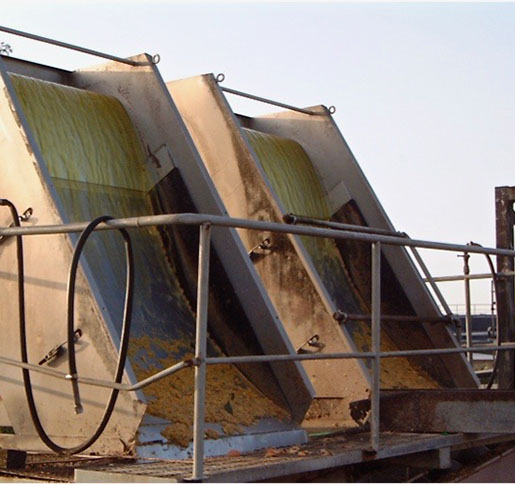 The waste water, incoming over a distribution box and distributor plate, flows evenly across to the slot direction along the curved screen surface. The solids are retained on the sieve surface and slide down. The filtered water flows through the slots down in the collection tray and drains off.