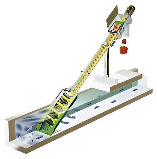 Die Siebschnecke wird direkt in ein Schmutzwassergerinne montiert. Das Abwasser durchströmt den Siebkorb, der die Feststoffe zurückhält. Während das Abwasser durch das Sieb fließt, fördert die wellenlose Spirale die Feststoffe nach oben zum Abwurf. Die Innenseite des Siebes wird während des Förderprozesses kontinuierlich von Spezialbürsten gereinigt, die am Außendurchmesser der Spirale befestigt sind. Ist die Schnecke mit einer Entwässerungs- und Kompaktiervorrichtung ausgestattet, wird das Siebgut entwässert und abhängig von den Materialeigenschaften auf mehr als 35% seines ursprünglichen Volumens reduziert.