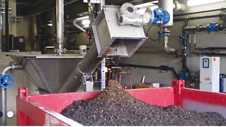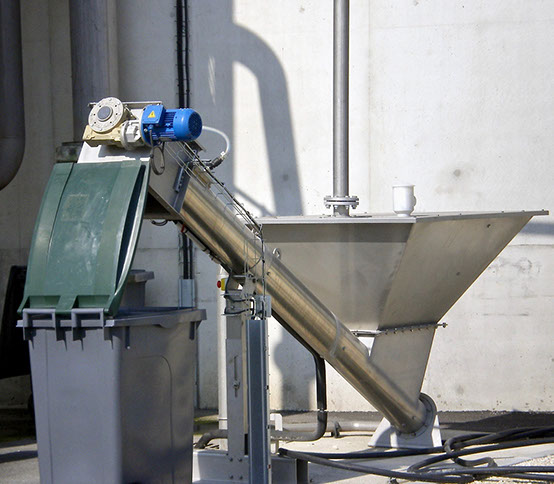 The waste water to be cleaned flows through the inlet nozzle of the PDS sand separator into the sedimentation tank, where the solid particles settle down. The low speed of the screw conveyor favours sedimentation. The dehydrated material is delivered through the feed screw upwards. Due to the oblique angle of the discharge screw, water flows back and thus a relatively dry product is delivered on the upper outlet.